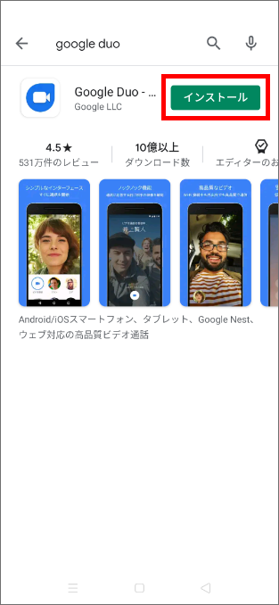 「Google Duo」が表示されたら、「インストール」ボタンを押します。