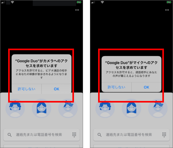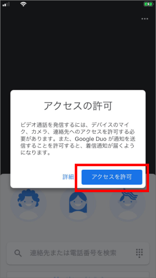 機種によっては、カメラとマイクのアクセス許可画面が出るので、必ず「OK」を押してください。