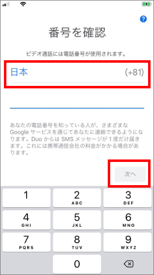 「番号を確認」の表示が出たら、お使いのスマートフォンの電話番号を入力し、次へのボタンを押します。