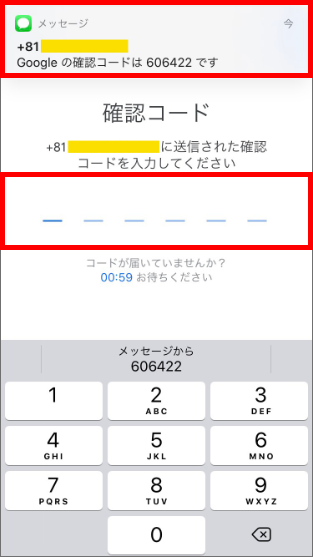 SMSに確認コードが送信されます。届いた6ケタの番号を入力します。